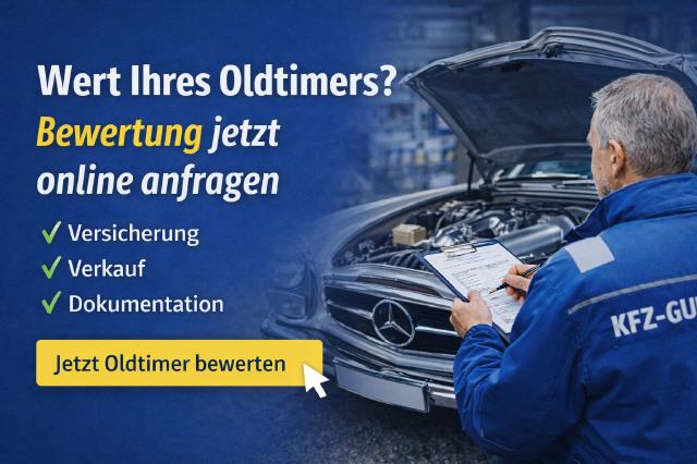 Für eine aussagekräftige Bewertung ist ein möglichst vollständiger Unterlagenbestand hilfreich (Fahrzeugpapiere, Rechnungen, Wartungsnachweise, Restaurierungsdokumentation, Fotos). Die Begutachtung erfolgt in der Regel am Standort des Fahrzeugs oder nach Absprache in Ihrer Werkstatt oder Halle.